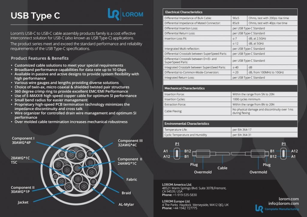Lorom’s unique manufacturing capability allows us to produce not only standard USB-C assemblies, it also allows us to custom design unique assemblies specific to your requirement, whatever the application. Download the PDF here.